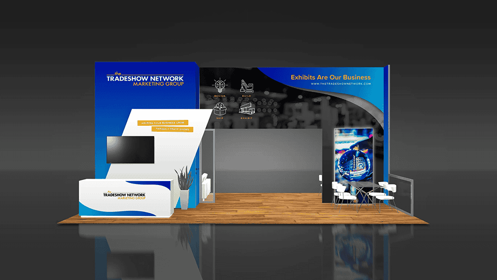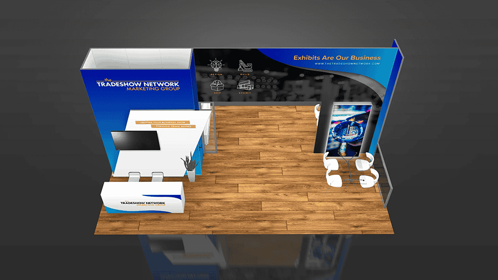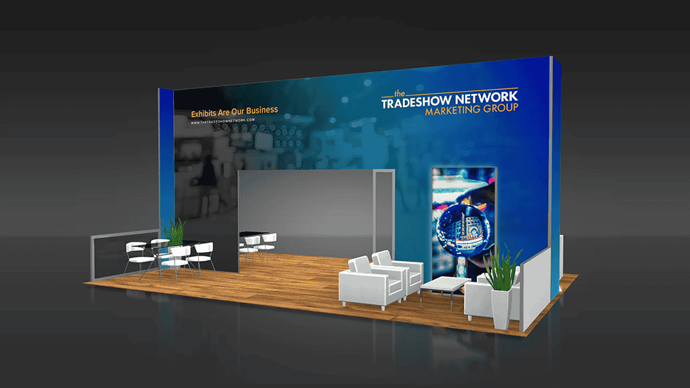 This 20x30 island booth structure is built with our modular frame system and has many unique features to highlight your product or service: